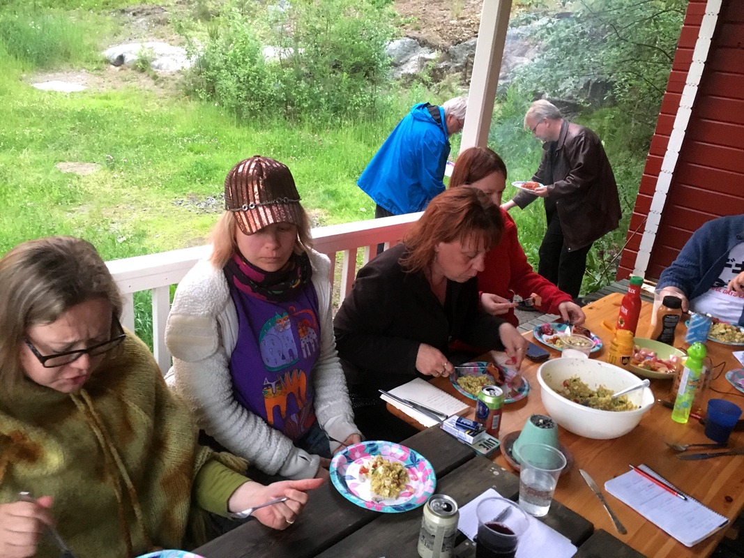 Rakkausrunoilijat kokoontuivat tänä vuonna kesämiittiin Rymättylään. Viikonlopun 30.6.-2.7. aikana nautittiin niin rauhallisista kuin menevistäkin hetkistä ja tietysti hyvästä rakkaasta runoseurasta! Porukka koostui jälleen niin tutuista kuin uusistakin kasvoista, osallistujia oli tällä kertaa kaikkiaan kymmenen. Majoituimme Lomahyppäyksen kauniissa merellisissä maisemissa kahden vierekkäisen mökin voimin. Saavuimme paikalle perjantaina iltapäivällä, ja nautimme alkuun puheenjohtajan tarjoamat kuoharit ja kakkukahvit. Asetuttuamme taloksi nautimme hetken terassilta avautuvasta maisemasta kunnes menimme päärakennukselle illalliselle. Otettiinpa samalla reissulla iloa hiukan irti myös paikalta löytyvästä trampoliinista :) Viereisessä haassa käyskentelevät hevoset, päärakennuksen lähellä majaa pitävät kanat ja chinchillat sekä pihalla käyskentelevä kissa toivat myös mukavan lisän miittiin. Käytössämme oli kelluva sauna, jonka laitoimme lämpiämään illallisen jälkeen. Saunan ovesta pääsi pulahtamaan suoriltaan mereen, ja osa miittiläisistä nauttikin meren vilvoittavasta syleilystä täysin siemauksin. Hyvien löylyjen jälkeen käyskenneltiin takaisin mökeille. Siellä illanvietto jatkui runoja kirjoittaen ja jutellen. Tällä kertaa innoitusta runoihin haettiin moninaisista musiikkikappaleista. Perjantain taittuessa lauantaiksi oli aika hiukan grillailla iltapalaa, ja mökin saunan löylyistä nauttimisen jälkeen kömmimme mökkeihimme nukkumaan. Lauantaiaamuna kokoonnuimme aamiaiselle, ja sen jälkeen kukin vietti hetken oman makunsa mukaan, osa lepäillen, osa tutkien ympäristöä, osa valokuvaten ja kirjoittaen. Yhdistyksen kevätkokouksen jälkeen saatiin vielä viimeinenkin miittiläinen paikalle ja alettiin odottelemaan illallisen alkamista. Syönnin päälle päästiin taas saunanlämmityspuuhiin, ja jäimmekin saunalautalle odottelemaan löylyihin pääsemistä. Taas uitiin ja saunottiin kauniissa maisemassa ja kiireettä, mikä ihana tapa viettää kesäiltaa! Löylyttelyjen jälkeen siirryttiin mökille, viriteltiin musiikit kohdilleen ja kirjoiteltiin jälleen yhdessä myöhään yöhön saakka. Välillä toki grillailtiin, ettei nälkä pääsisi yllättämään. Sunnuntaiaamuna oli päärakennuksella taas tarjolla aamiainen, ja mökilläkin nautittiin jonkinmoinen myöhäisaamiainen. Pakkailulla ei ollut kiire, sillä mökit olivat käytössämme myöhään iltapäivään saakka. Hiljalleen tuli kuitenkin aika pakata laukut ja halata heiheit runoystävien kanssa. Miitti ei taaskaan pettänyt – perinteiset antimet kuten hyvä seura, yhdessä kirjoittaminen, mainio huumori ja mahdollisuus olla paikalla juuri sellaisena kuin oikeasti on olivat jälleen tarjolla runoseurakunnallemme. Sääkin suosi kohtuullisesti, ja miljöö oli oikein miellyttävä. Kiitos koko porukalle hienosta miittiviikonlopusta! Teksti: Godis/Karoliina Mäkelä |