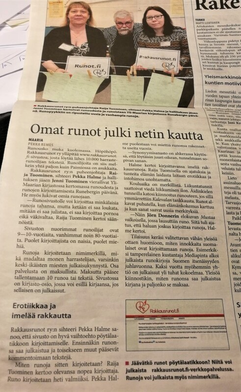 Rakkausrunot ry Yli-Maarian kirjastossa Runebergin päivän runoilta Raija Tuominen, Jenni Tuominen ja Pekka Halme Turun Tienoo-lehti oli myös paikalla ja kirjoitti tapahtumasta jutun. |